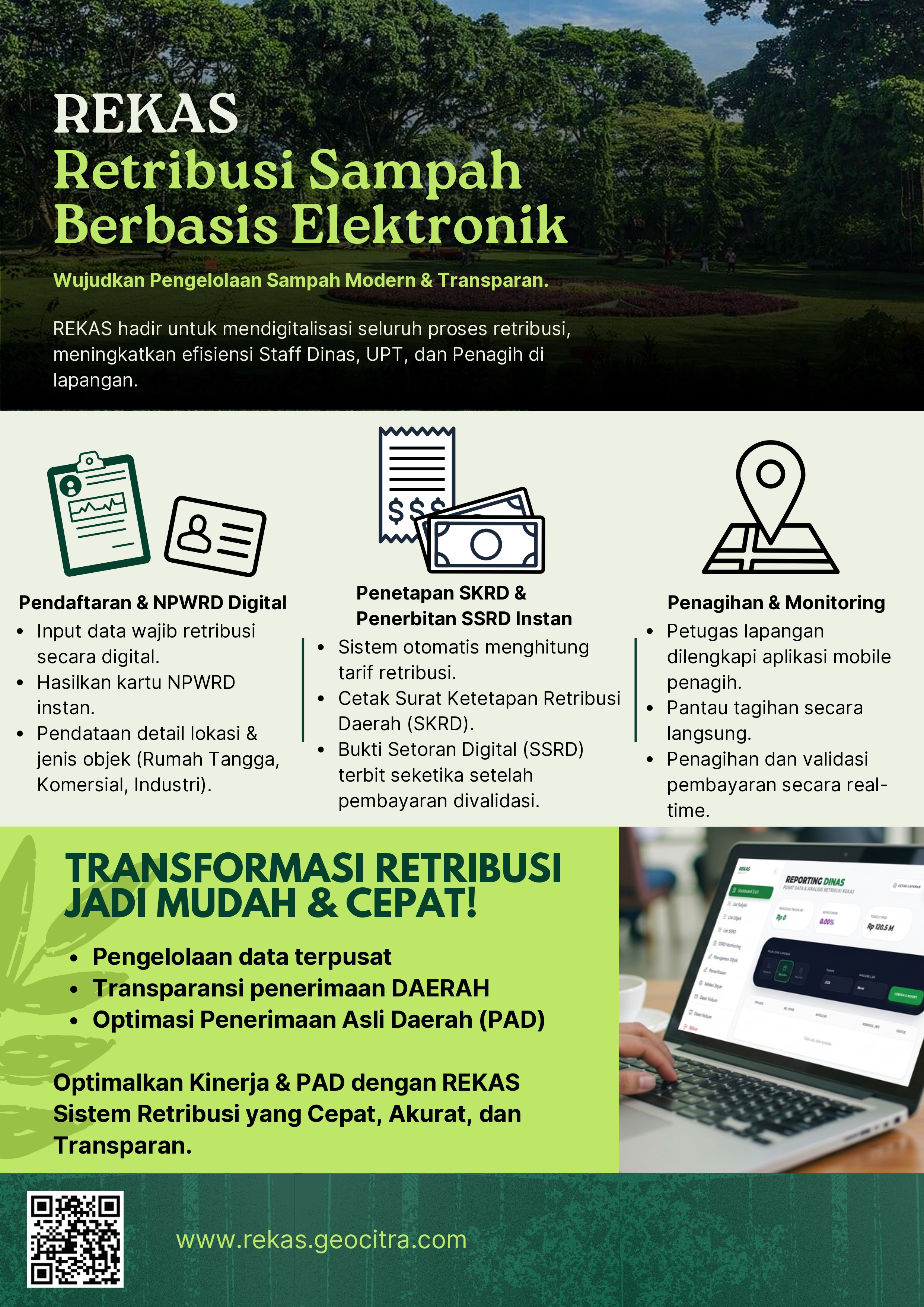 REKAS mendigitalisasi seluruh proses retribusi dari hulu ke hilir untuk meningkatkan efisiensi kerja Staff Dinas, UPT, hingga Petugas Penagih di lapangan.